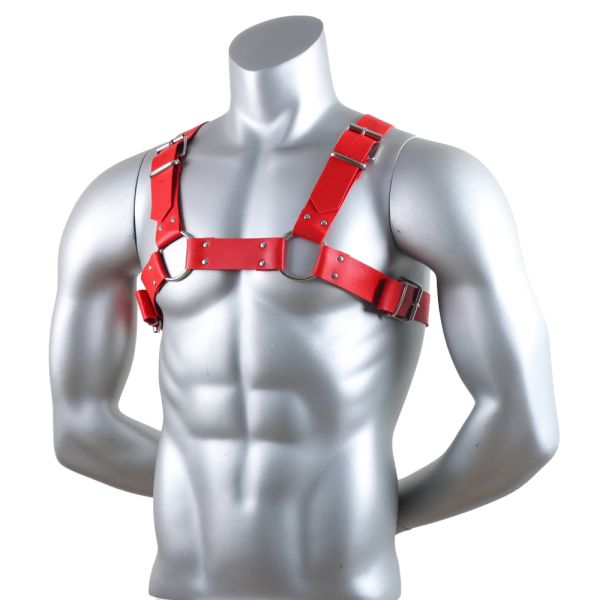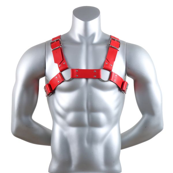 Juega el rol que quieras con este arnés para pecho Bulldog. Correas gruesas en tirantes con una unión. Correas ajustables con broches metálicos. Uniones de correas con argollas. Hecho de vinipiel y broches de metal. Color rojo
