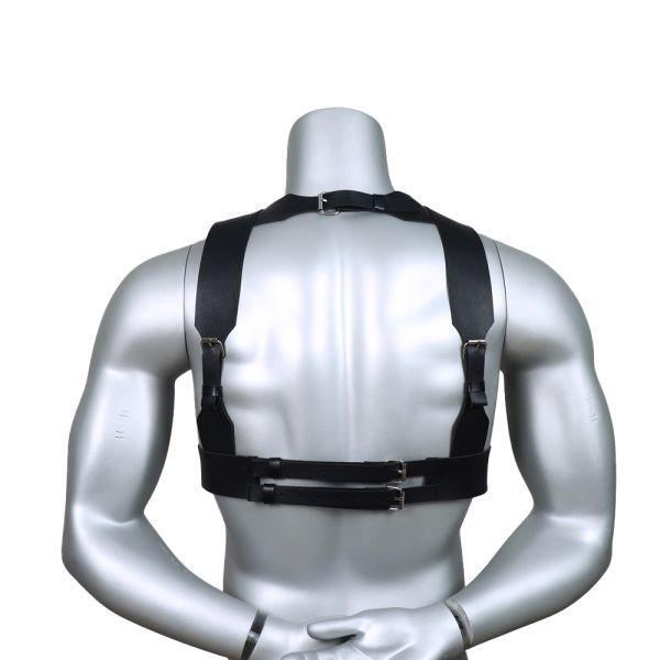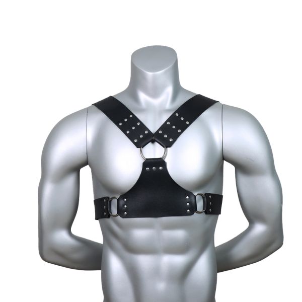 Luce tu cuerpo con el arnés Cruising. Tiras cruzadas en tirantes y costillas que se unen a la base triangular al frente. Correas gruesas con remaches de metal y uniones en argollas que te ayudan con sujetar esposas. Correas ajustables con hebillas en la parte posterior. Hecho de vinipiel, color negro. Unitalla
